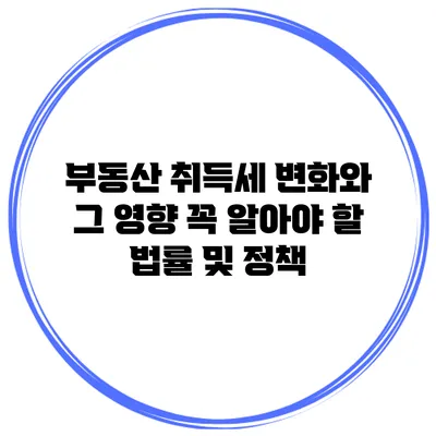 부동산 취득세는 부동산 거래의 중요한 요소로, 이를 둘러싼 법률 및 정책의 변화는 많은 사람들에게 직접적인 영향을 미치고 있어요. 시대에 따라 변화하는 이러한 세금 제도를 이해하는 것은 부동산 소유 및 거래를 고려하는 모든 이들에게 필수적입니다. 부동산 취득세 관련 법률 및 정책 변화는 항상 주의 깊게 살펴보아야 할 중요한 사안이에요.