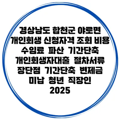 경상남도 합천군 야로면 개인회생 신청자격 조회 비용 수임료 | 파산 | 기간단축 | 개인회생자대출 | 절차서류 | 장단점 | 기간단축 | 변제금 미납 | 청년 | 직장인 2025